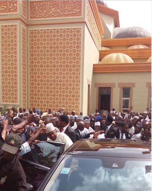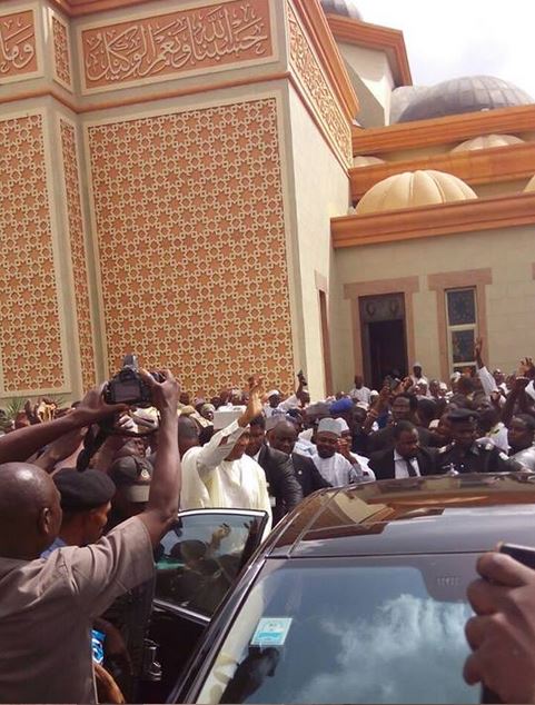 Senate President, Bukola Saraki who arrived Illorin, the capital of Kwara state earlier yesterday was mobbed by a massive crowd who gathered to hail him after after Ju'at prayer at Ilorin Central Mosque.