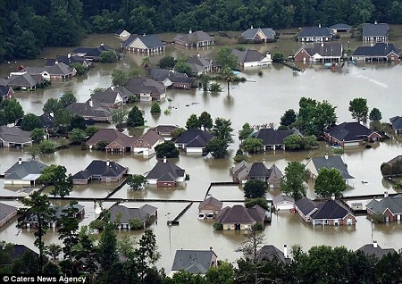 In shocking photos showing the devastation, caskets that had washed up from a graveyard floated down the street in Denham Springs, Louisiana.